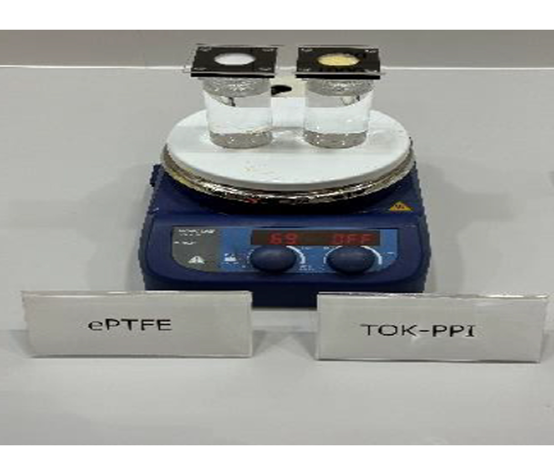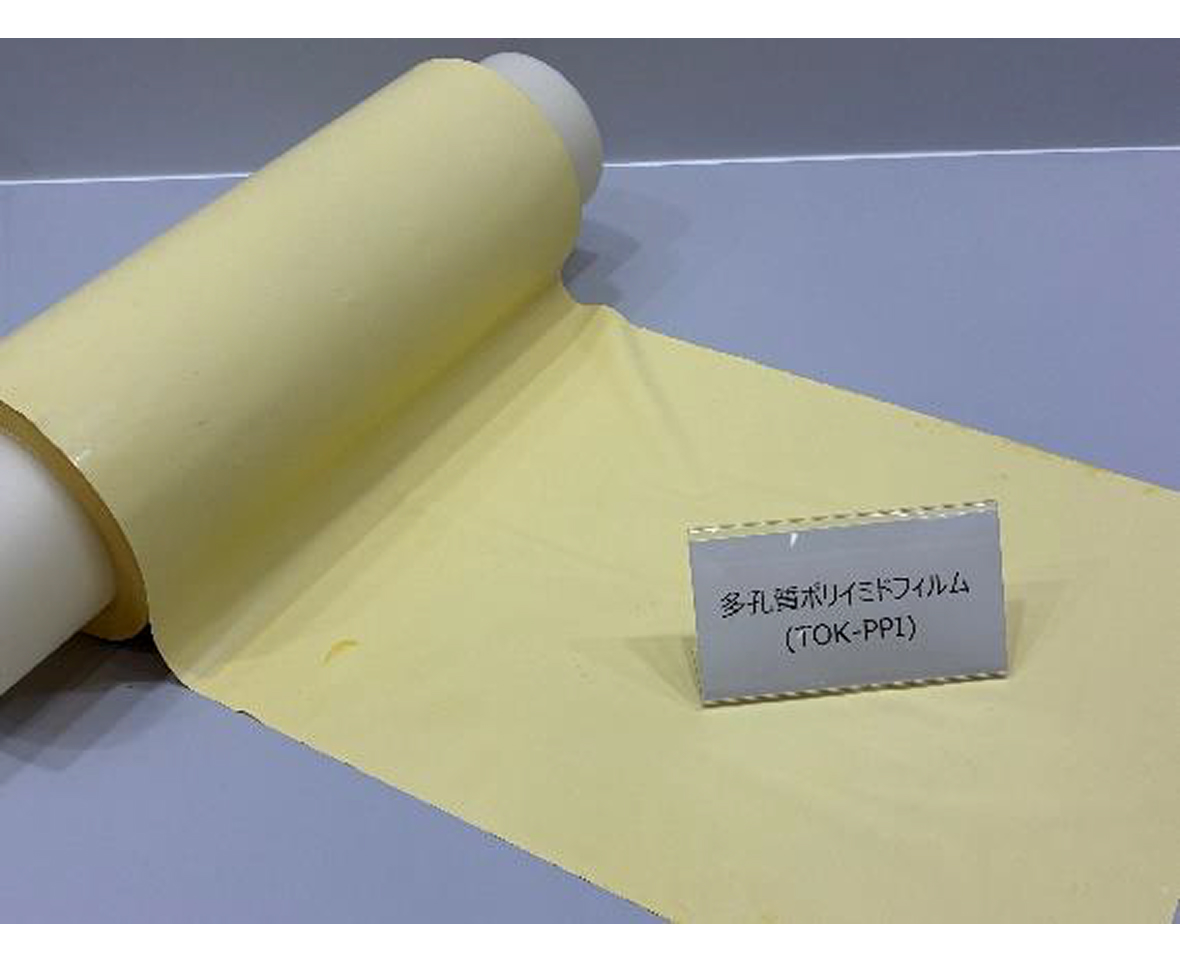 TOKの多孔質ポリイミドフィルムは、独自の加工プロセスにより均一で精密なナノレベルの微細孔を形成したユニークな多孔質構造を有しています。この均一微細孔構造により、防水性と透気性を両立する特性を発揮するとともに、高耐熱性・耐薬品性・電気絶縁性を兼ね備えた高機能フィルムとして多用途での使用が期待できます。 さらに、本フィルムはPFAS-Freeのポリイミド素材を用いており、ポリイミド本来の優れた耐熱性・耐薬品性を維持しています。そのため、環境規制の強化が進む中、従来ePTFEが用いられてきた用途において、代替膜として活用可能な高いポテンシャルを有しています。
