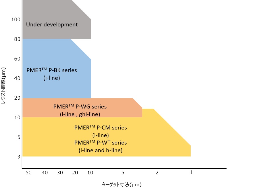 高密度半導体実装における2.5/3Dシリコン貫通電極パッケージ、TSV積層メモリー、WL-CSP ( ウエハレベルチップサイズパッケージ ) 、Cu ピラー / フィリップチップパッケージや LCDドライバーのマイクロバンプ / 金スタットバンプ / Cuポストの電極形成に用いられるノンシアン金、銀、 錫、 銅、 ニッケルの各種金属のめっき液への耐性を持った電解めっき用途の高解像ポジ型厚膜レジストです。